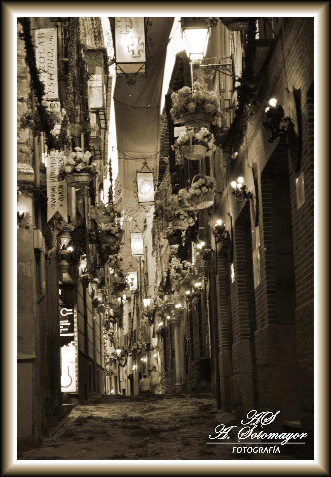 Subiremos varias fotografías de como se engalana las calles y en días sucesivos pondremos algunas fotografías de la procesión, pero todas las fotografías serán en sepia, pues así os dejo a vuestra imaginación el colorido que toma Toledo en esos días.